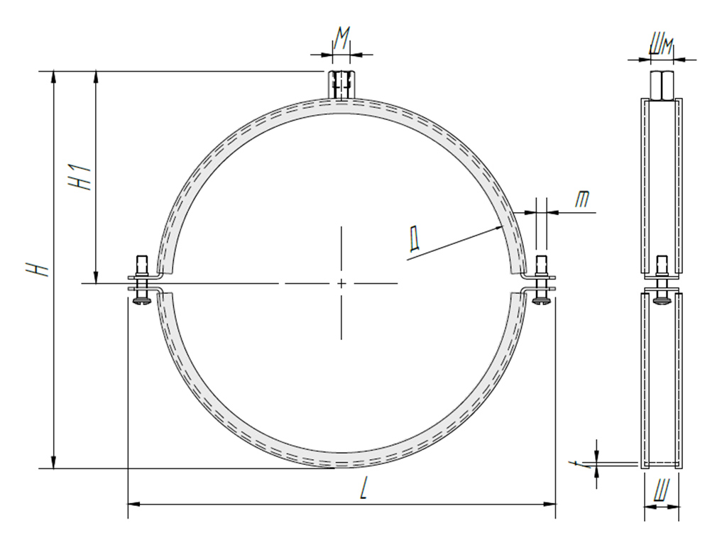 Изготовлено для крепления труб со спиральными швами, соответствующих стандарту DIN24145/EN1506, в системах вентиляции , кондиционирования и технологических процессах Стопорный винт с фиксирующей шайбой для предотвращения выпадания при монтаже Простая установка благодаря большому углу открывания Устойчивая звукоизоляционная вставка для плотной посадки Материал: сталь оцинкованная (по стандарту DIN EN 10327) Вставка: EPDM; не содержит хлора; не содержит силикона Звукопоглощение: в соответствии с DIN 4109 Термостойкость: от -50 °C до +110 °C Огнестойкость: класс B2 в соответствии с DIN 4102 Артикул Наименование Д (диаметр зажима) М (резьба соед.) Ш х t L H H1 Шм m Нагрузка, N Уп.мин 83100 ТМС КВ Вентиляционный хомут с epdm M8 100мм 100 М8 20 х 1,5 148 121 64 13 М6 х 25 800 1 83125 ТМС КВ Вентиляционный хомут с epdm M8 125мм 125 173 146 77 83160 ТМС КВ Вентиляционный хомут с epdm M8 160мм 160 208 181 94 83200 ТМС КВ Вентиляционный хомут с epdm M8 200мм 200 248 221 114 83250 ТМС КВ Вентиляционный хомут с epdm M8/10 250мм 250 М8/М10 25 х 1,5 302 280 М8 х 30 1000 83315 ТМС КВ Вентиляционный хомут с epdm M8/10 315мм 315 367 345