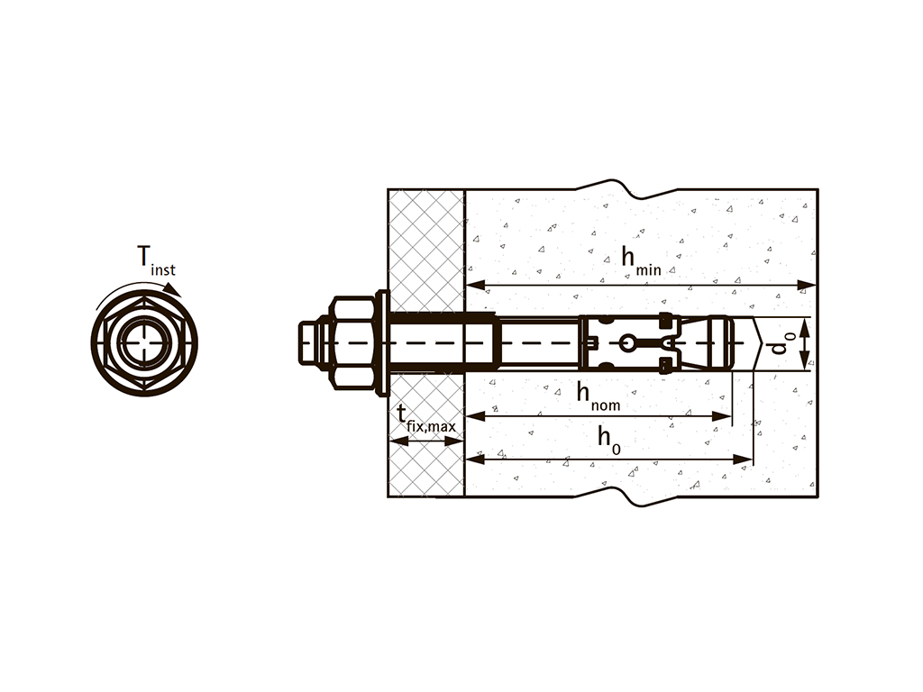 широка область применения подходит для монтажа в сжатую зону бетона (без трещин) высока несущая способность нагружение сразу после установки холодноформованный стержень предотвращает излом при изгибе малые межосевые и краевые расстояния подходит для крепления несущих конструкций и оборудования монтаж в бетон и природный камень
